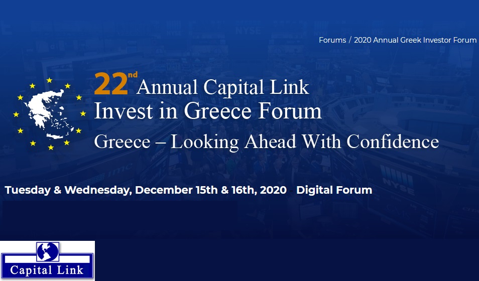Το “22nd Capital Link Invest in Greece” Forum: “Greece – Looking Ahead With Confidence” θα πραγματοποιηθεί την Τρίτη 15 & την Τετάρτη 16 Δεκεμβρίου, 2020 ως ψηφιακό συνέδριο, σε συνεργασία με το New York Stock Exchange και μεγάλες Διεθνείς Τράπεζες και Οργανισμούς. Πρόκειται για ένα Διεθνές Συνέδριο για την Ελλάδα που πραγματοποιείται σε συνεργασία με το Χρηματιστήριο της Νέας Υόρκης και μεγάλες διεθνείς επενδυτικές τράπεζες.